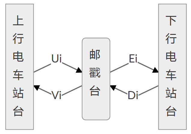 每个车站设有上行电车的站台和下行电车的站台,连接两个站台的道路上设有邮戳台。