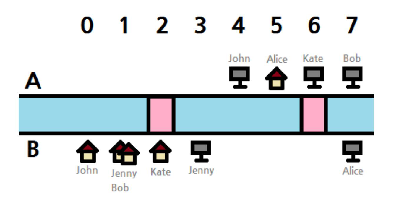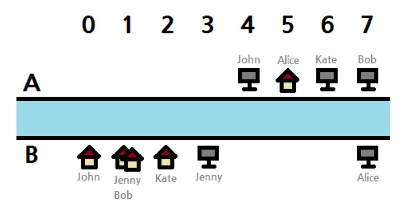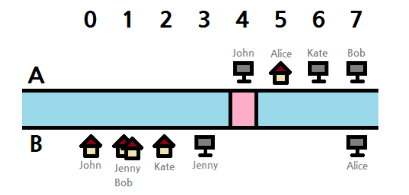 每一块区域沿着河岸都建了恰好 栋楼,每条岸边的楼都从 编号到 。相邻的每对楼相隔 个单位距离,河的宽度也是 个单位长度。区域 A 中的 号楼恰好与区域 B 中的 号楼隔河相对。