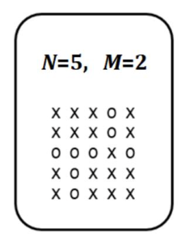 翻牌游戏是一种单人卡牌游戏,使用两种类型的卡牌 A 和 B。卡牌 A 上写有游戏规则的信息,具体来说,如图 1 所示,包含两个整数 和 ,以及一个 的由字符 O 和 X 组成的图案 。