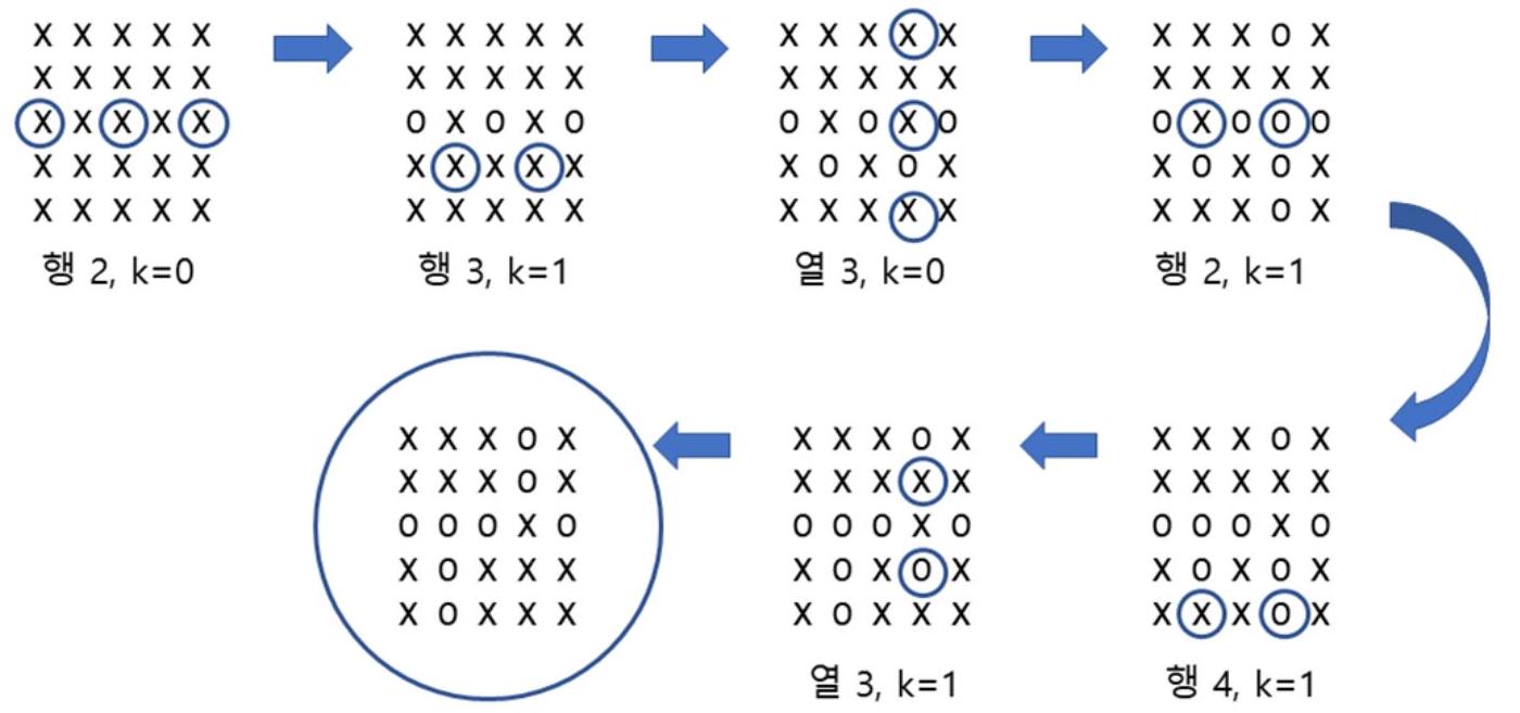reversal(5, 2, [XXXOX, XXXOX, OOOXO, XOXXX, XOXXX]);