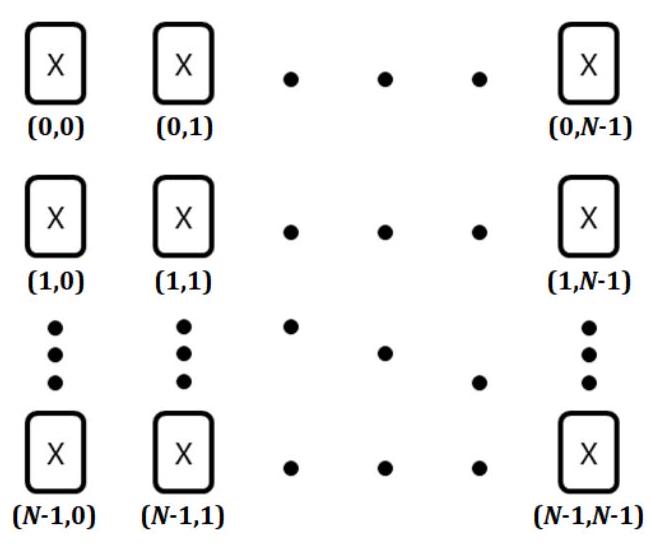 游戏开始时,选择一张卡牌 A,并根据卡牌上的 值,将卡牌 B 按 的格子排列。初始时,所有卡牌 B 都显示 X。每张卡牌的位置如图 2 所示,用行号和列号区分。