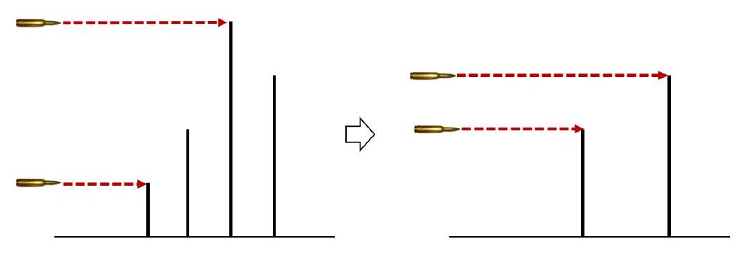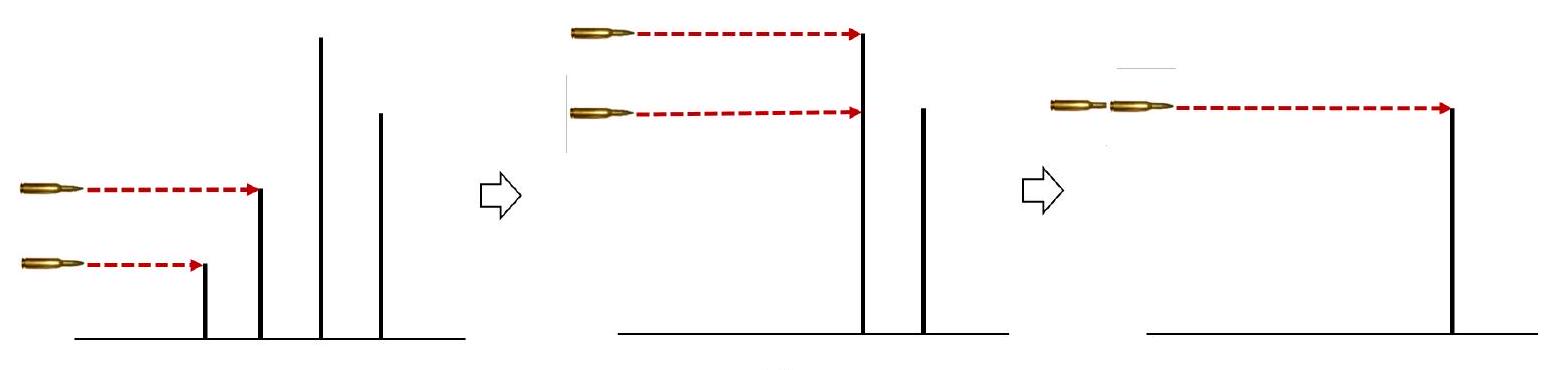 如果玩家的子弹发射高度为 ,则满足 的最左边未被摧毁的建筑物会被这颗子弹摧毁。如果没有满足条件的建筑物,则什么也不会发生。如果两名玩家发射的子弹满足条件的建筑物相同(因为子弹速度相同),则只有一座建筑物会被摧毁。特别地,如果两名玩家的发射高度相同,则总是只有一座建筑物会被摧毁。例如,如果 ,并且两名玩家都选择 作为发射高度,则只有建筑物 会被摧毁。
