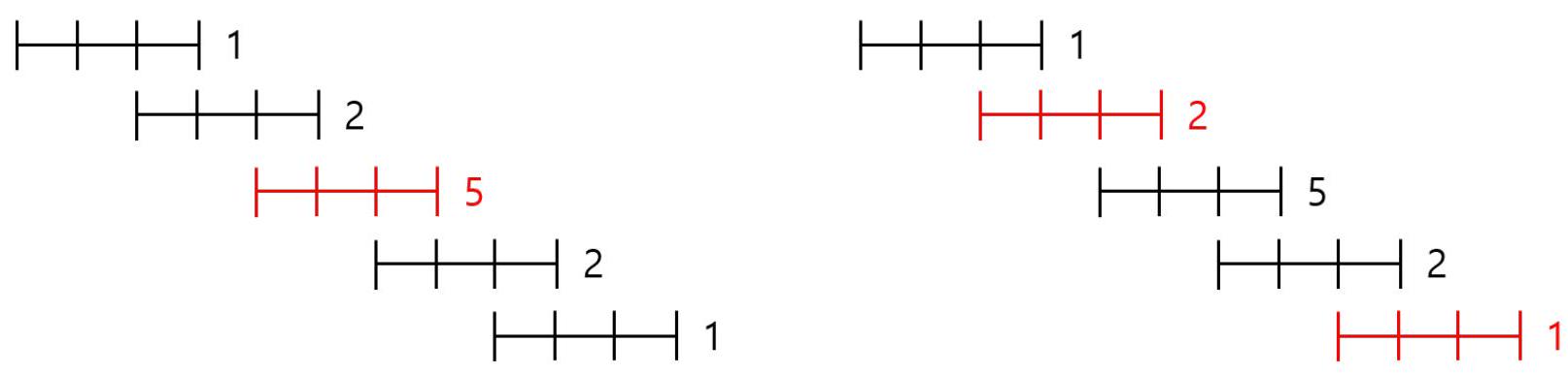 考虑 $N=5, K=2, S=[1,3,5,7,9], E=[4,6,8,10,12], W=[1,2,5,2,1]$ 的情况。