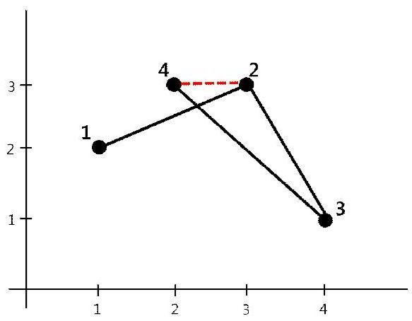 例如,下图中有 个城市和连接城市之间的 3 条道路(实线)。可以新建的道路有 条( 和 之间, 和 之间, 和 之间)。在这些候选中,如图所示,在 和 之间新建一条道路(虚线),城市的直径为 ,这是最小值。