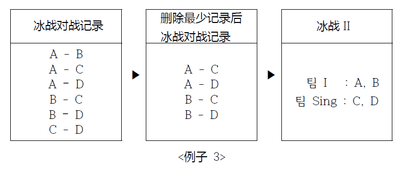 为了解决这个问题,我们决定删除最少数量的对战记录。例如,考虑下图中四名玩家 、、、 的冰战对战记录(左图)。在这种情况下,至少需要删除一条记录,如果删除 (中图),则可以组成两个团队(右图)。