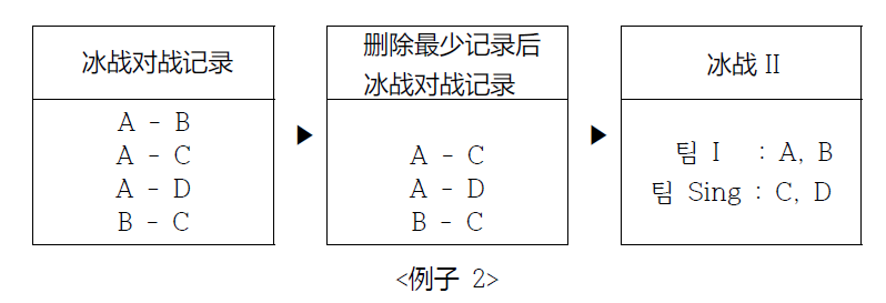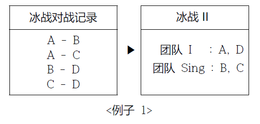 另一个例子,考虑以下冰战对战记录。在这种情况下,至少需要删除两条对战记录,如果删除 和 ,则可以组成两个团队。
