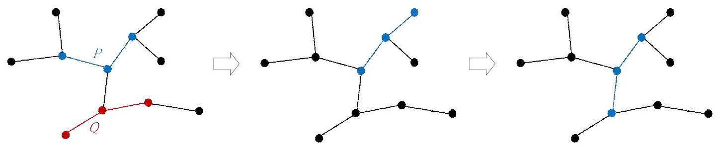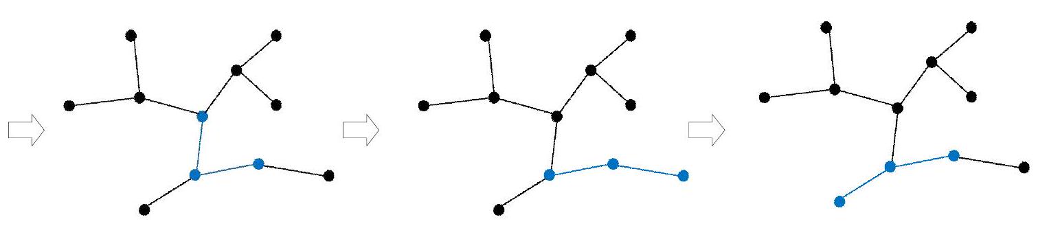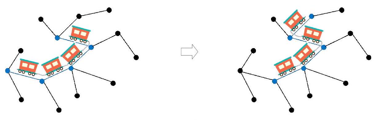 列车可以沿着轨道移动。列车的移动是分阶段进行的,每个阶段列车的一端车厢移动到相邻的另一条边上。具体来说,对于表示列车的路径 ,一次移动的结果是将 的一端顶点和相邻的 之外的边和顶点添加到 中,并将另一端的顶点和边从 中移除(见图 1)。注意,每个阶段路径的长度保持不变。