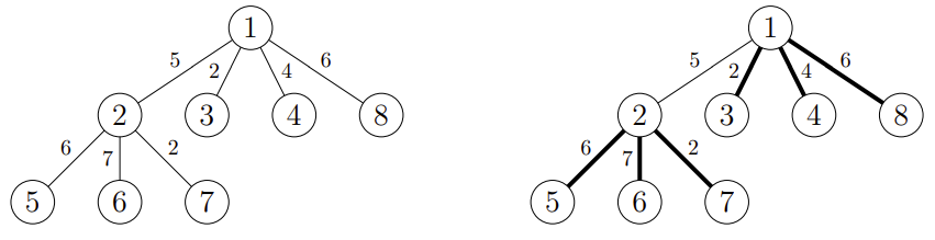 计划对弗拉特兰的网络进行升级,将一些有线通信渠道替换为更先进的光纤通信渠道。光纤渠道只能替换现有的有线渠道。将连接城市 i 和城市 pi 的渠道替换为光纤的成本为 wi。由于技术限制,任何连接中心最多只能通过光纤渠道连接到 k 个其他中心。
