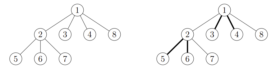 在弗拉特兰有 n 个城市,编号从 1 到 n,其中首都的编号为 1。弗拉特兰的计算机网络结构如下:每个城市都有一个连接中心,可以通过有线通信渠道与其他一些中心相连。任意两个城市之间只有一条路径连接,也就是说,这个网络是一个树形结构。对于编号为 i (i>1) 的城市,从城市 i 到首都的路径上的第一个城市记为 pi。