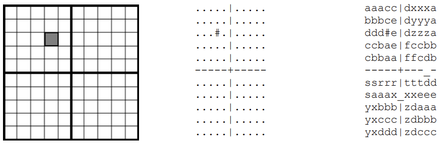 一个单元格由一个字符表示。字符 . 表示空单元格,字符 # 表示稻草人。纵向围栏用字符 | 表示,横向围栏用字符 - 表示。字符 + 表示围栏的交叉点。
