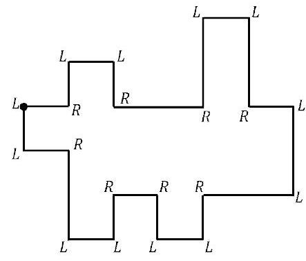 考虑一个由水平和垂直边组成,并有 个顶点的多边形 。多边形 的边只能在端点相交,每个顶点正好有两条边的端点相交。当沿着多边形 的边逆时针移动时,会在顶点处向左或向右转弯。如果在顶点处向左转弯,用 表示;向右转弯,则用 表示。这样就可以用 和 组成的字符串来表示多边形。例如,图 1 中的多边形可以用字符串
