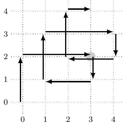 机器人会在启动后的第 6 秒和第 22 秒到达点 (3,2)。其路径如下图所示。