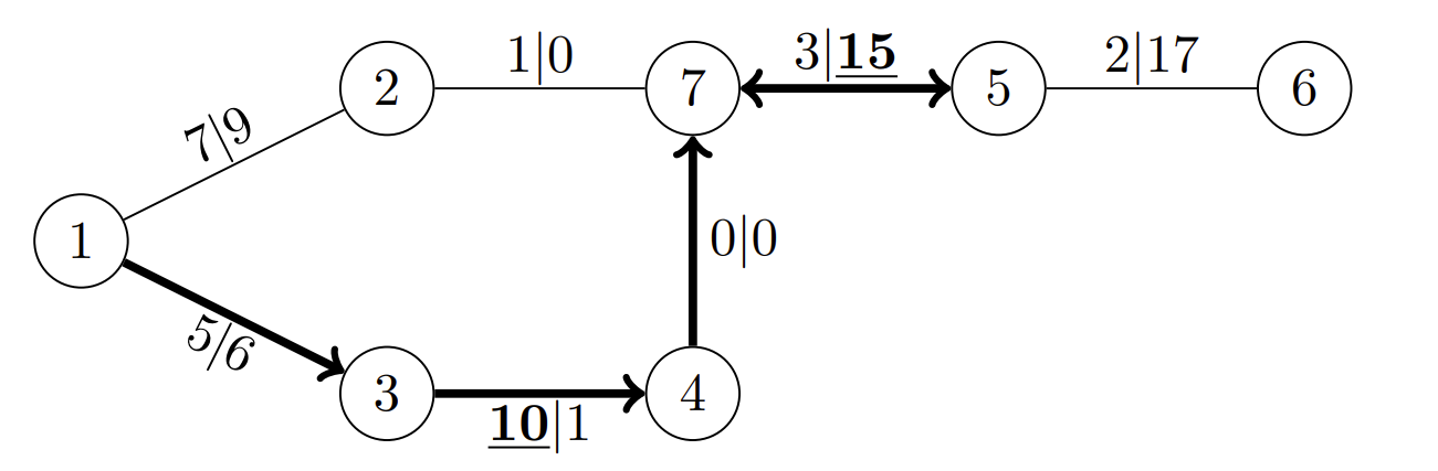 从城市 3 到 4 的道路提供类型 1 剑的最大价值 10。无法在 6 天内同时经过 3 到 4 和 5 到 6 的道路。因此,骑士选择类型 2 剑价值 15,通过 5 到 7 的道路。路径为 1,3,4,7,5,7,剩余 1 天未使用。