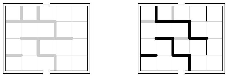 要让树篱构成迷宫,必须满足一个额外条件:从任一入口出发,都能到达每个方格,且路径唯一(从一个方格可直接进入相邻方格,前提是分隔两者的边上没有树篱。两条路径若经过的方格集合不同,则视为不同路径)。