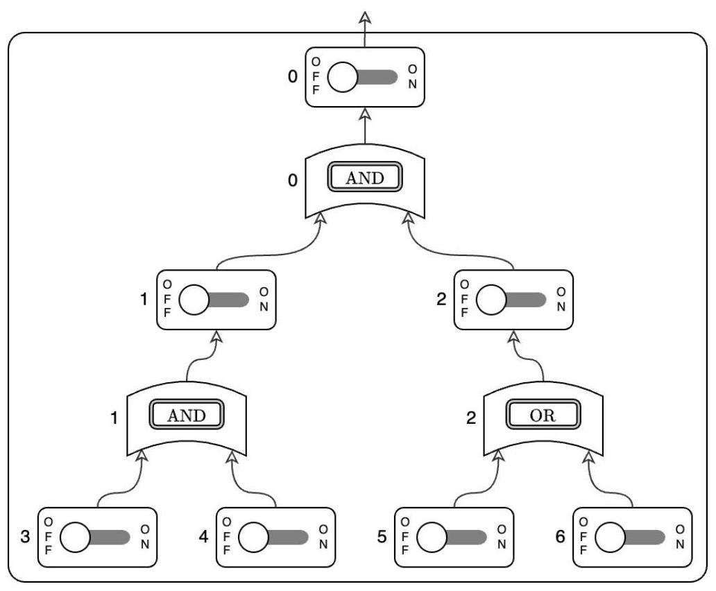 JOI 君正在玩一套电子电路玩具。这套玩具包含 个 AND 元件、 个 OR 元件以及一个电路板。电路板上有 个开关和 个元件插槽,你可以将 AND 或 OR 部件插入插槽使用。电路板根据安装的元件和开关状态,以以下方式输出 或 的值。