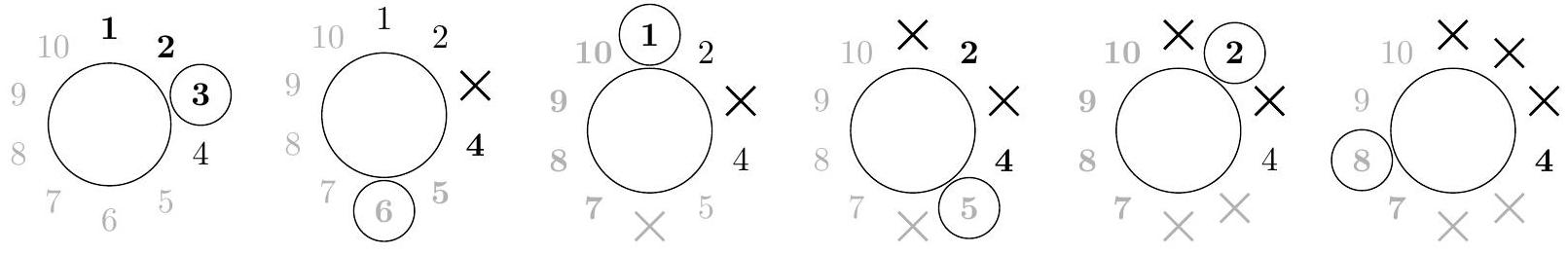 有 4 只雄鸟(编号 1,…,4)和 6 只雌鸟(编号 5,…,10)。「我的小鸽子」有 3 个音符,「我爱你小鸽子」有 5 个音符。需找出第 6 只飞离的鸟。下图展示了依次演唱的求偶曲。雄鸟编号用黑色标记,雌鸟编号用灰色标记: