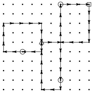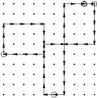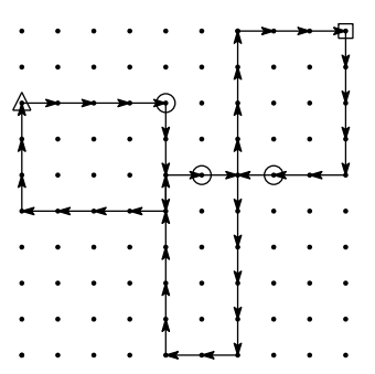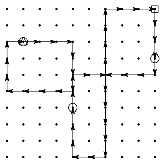 上图展示了 JOI 市从空中俯瞰的情景,圆圈表示公交车的当前位置,箭头表示公交车的运行路线。JOI 君的起点用三角形标记,目的地比赛场地用矩形标记。