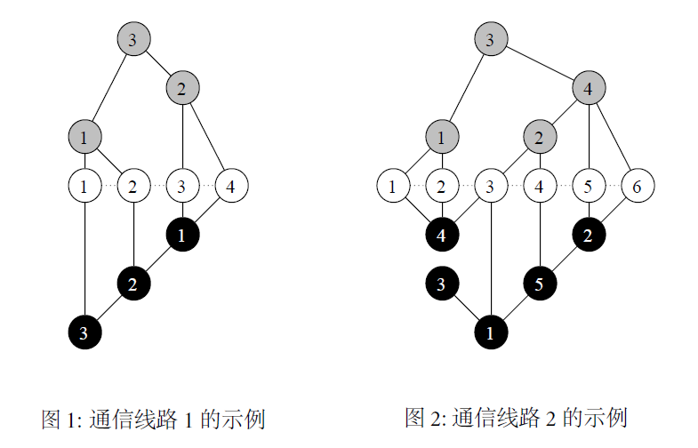 下图展示了通信线路的示例,灰色圆圈代表系统 1 的枢纽,黑色圆圈代表系统 2 的枢纽,白色圆圈代表村庄。