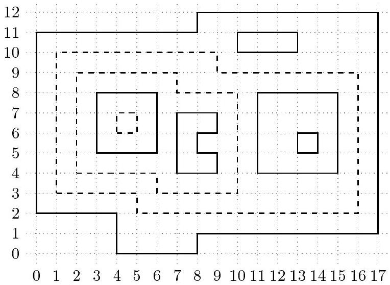 不幸的是,他怀疑地图上只包含了部分等高线,实际山峰可能更高。现在,他试图在地图上添加新的等高线,以获得尽可能高的山峰。请帮助 Bajtazar,编写一个程序完成这项任务。新添加的等高线必须是闭合的普通折线,满足与地图上等高线相同的条件(整数坐标、边与坐标轴平行、不与其他等高线交叉、包含在“外部”等高线内)。