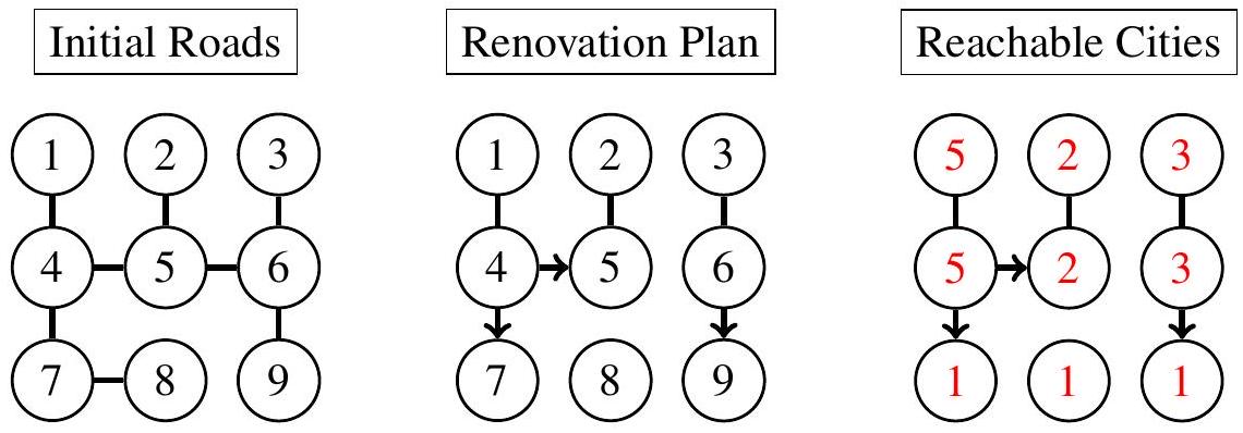 如果存在一个序列 ,其中 ,,且对于所有 ,从 到 存在可通行的道路,则城市 可从城市 到达。特别地,每个城市都可以到达自身。