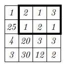 Bajtazar 打算购买土地的区域是一个边长为 米的正方形。土地的当前所有者为每平方米设定了不同的价格。Bajtazar 进行了详细调查,制作了该区域的价格地图。该地图描述了每个一米乘一米的方块的价格。这样的方块总共有 个。现在需要确定理想的土地。这块土地必须是矩形,且只能由完整的单位方块组成。Bajtazar 开始在地图上寻找合适的土地,但尽管努力,他仍未能找到合适的矩形。请帮助 Bajtazar 解决这个问题。