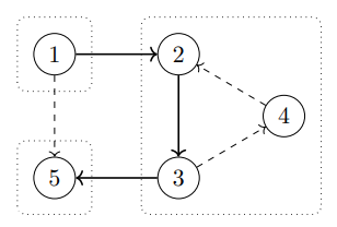 在用虚线标注的边上可以擦除方向。确实,边 不能反向,否则顶点 、、 和 将处于同一强连通分量。边 和 也不能反向,否则顶点 、 和 将不再处于同一强连通分量。