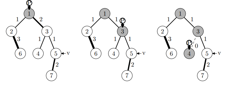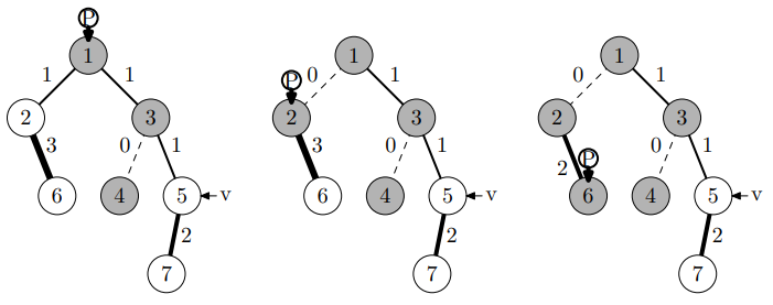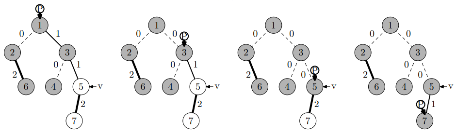 在 E 城的娱乐中心安装了一台新一代的游戏机。玩家可以向机器投掷硬币,并观察硬币从顶部到底部穿过一个分叉的管道迷宫。迷宫中有 个节点,编号从 到 。当硬币被投入时,它会首先进入编号为 的节点。除了第一个节点外,每个节点都有一个从上方进入的管道,硬币可以通过该管道到达该节点。每个节点最多有两条向下延伸的管道,一条通向左下方,另一条通向右下方。每条管道都有一定的宽度。硬币会优先掉入宽度较大的管道,如果两条管道宽度相等,则会选择左侧的管道。