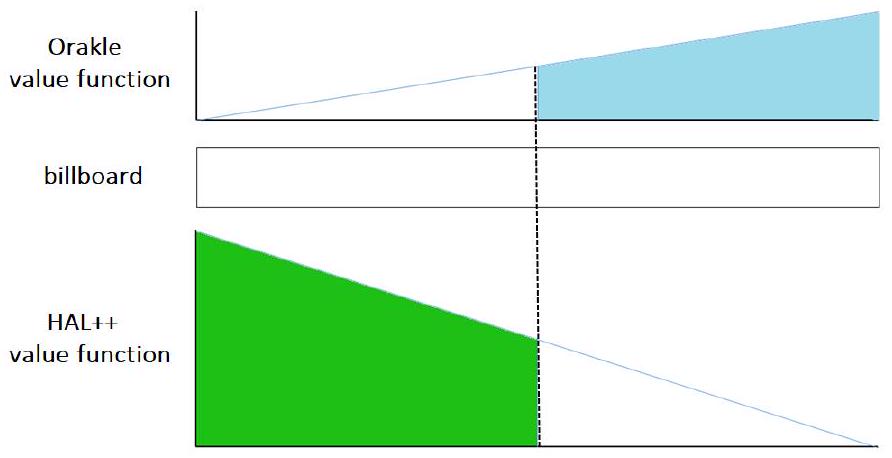 Figure A. 1 shows a simple example. The billboard length is 1010 and there are two sponsors, Orakle Software and Hal++, both of them having a value function with only one piece. Orakle's value function indicates that the company increasingly prefers sections of the billboard as you move left to right, while Hal++'s value function indicates the opposite. The area under each function is the total value of the billboard from each sponsor's perspective. The blue and the green areas shown are both larger than half of each total area, so cutting the billboard in the middle (the dashed line) is a valid solution, resulting in the billboard shown in Figure A.2. Note that there are many other divisions of the billboard that work as well (for example, cuttings at 44 or 66 are also valid solutions, if the sections of billboards are given to the correct sponsor).