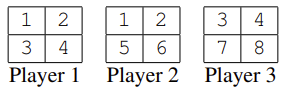 Formally, there are players, each receiving a (possibly) different sheet of (not necessarily distinct) numbers. Player 1 is faster to react than player 2, who in turn is faster than player 3, and so on, with player being the slowest. Consider the following example, corresponding to the first sample input, where three players receive four numbers each: